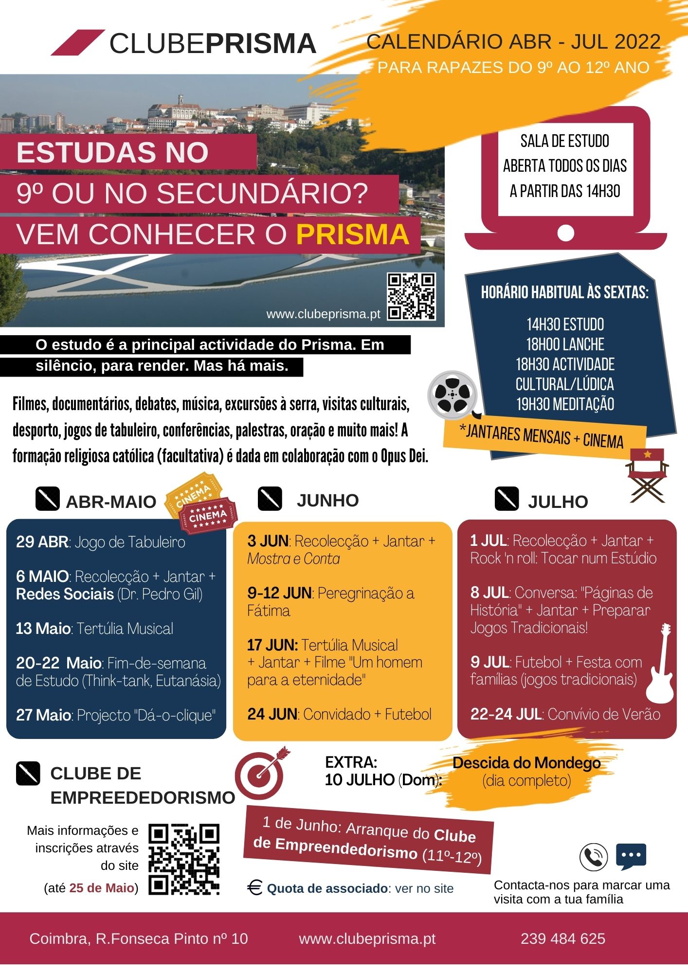 O Prisma é um espaço para atividades extra-curriculares e de ocupação dos tempos livres, em Coimbra. É um centro educativo complementar à família e à escola. A formação religiosa católica (facultativa) é dada em colaboração com o Opus Dei. Para rapazes do 5º ao 12º ano, com actividades divididas por faixas etárias. Saiba mais, abaixo.
